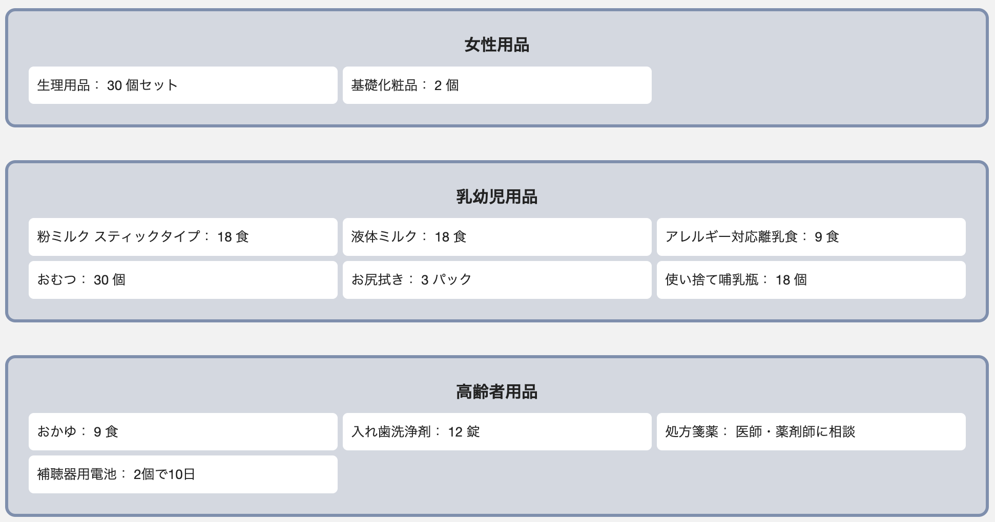 女性や高齢者を選択すると、必要な生理用品も教えてくれるので便利です。