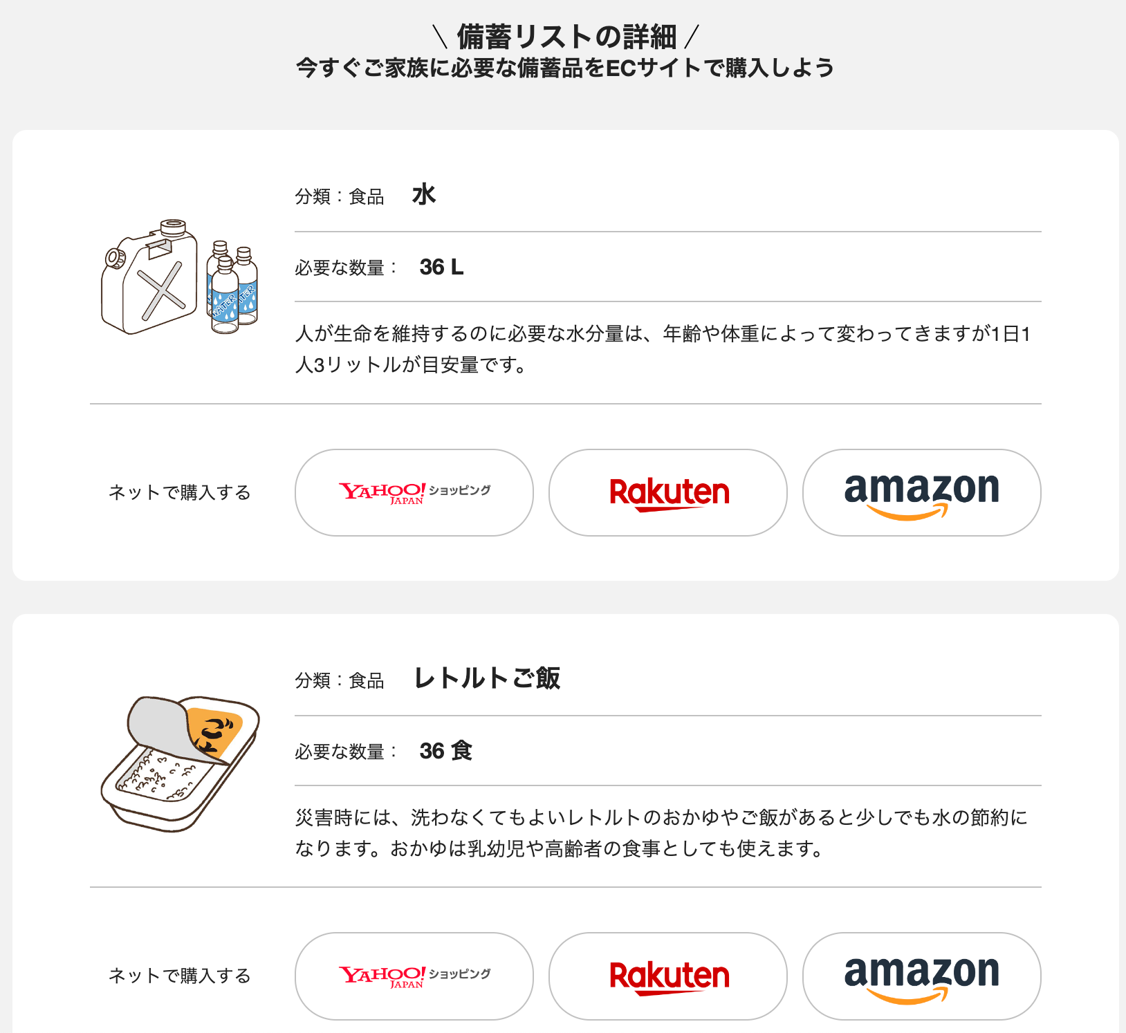 備蓄リストの商品は、サイト内のリンク先から購入できます。