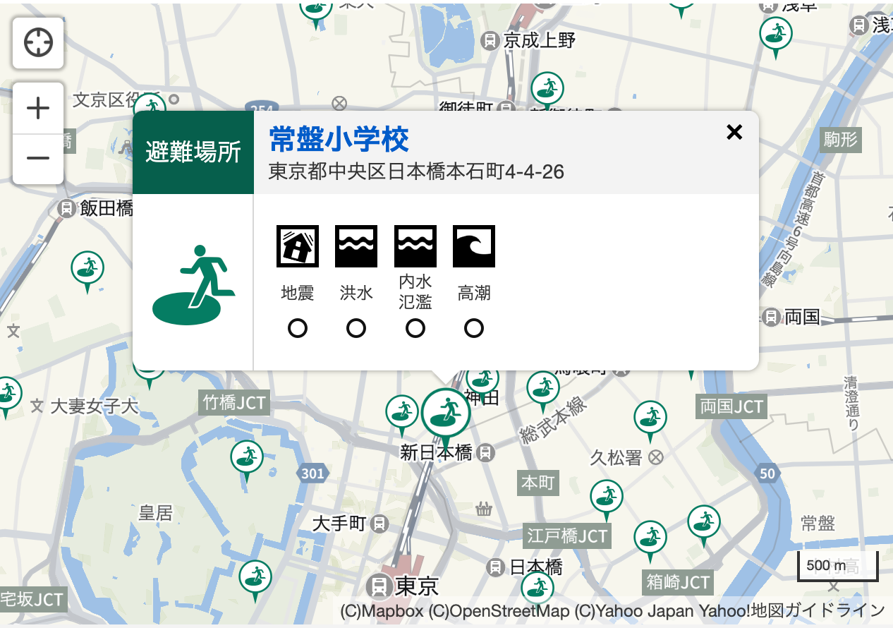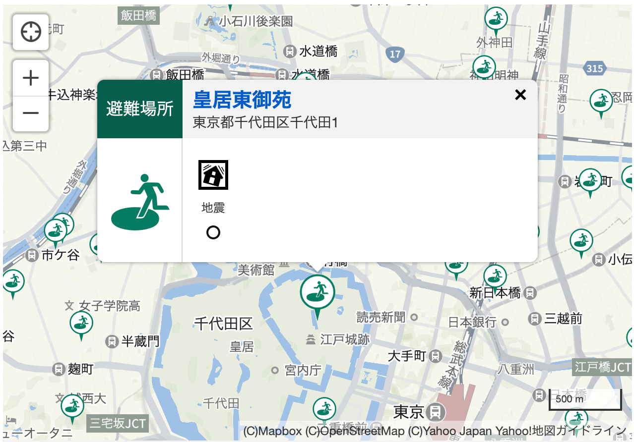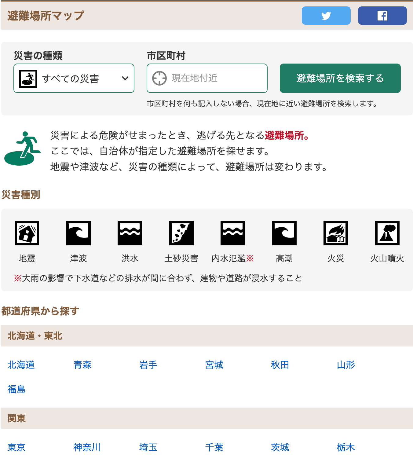 施設の住所を入力すると、近隣の避難場所が検索できます。