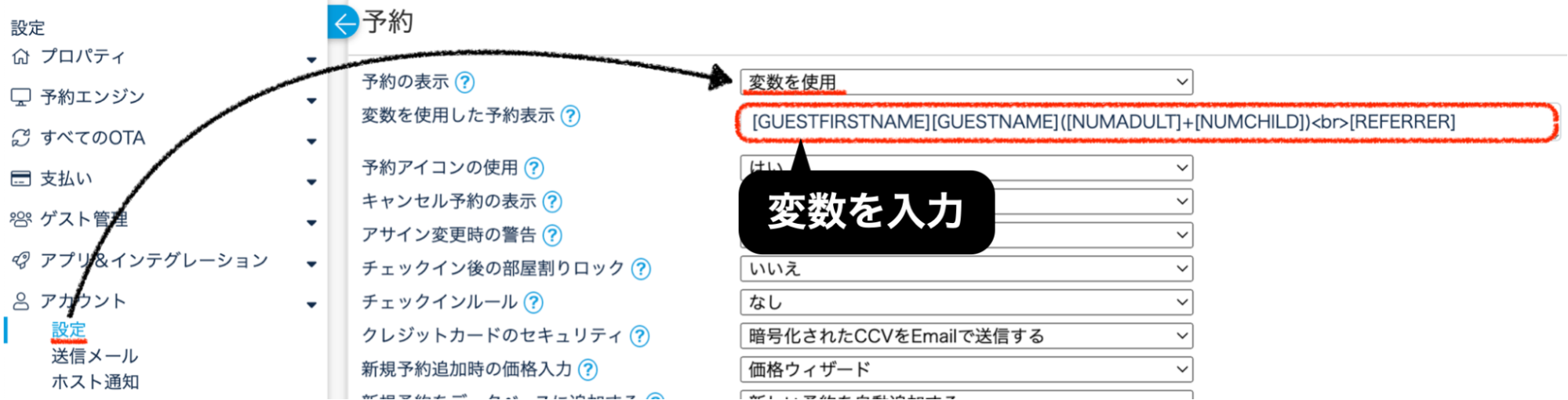 ②予約の表示のプルダウンから『変数を使用』を選択