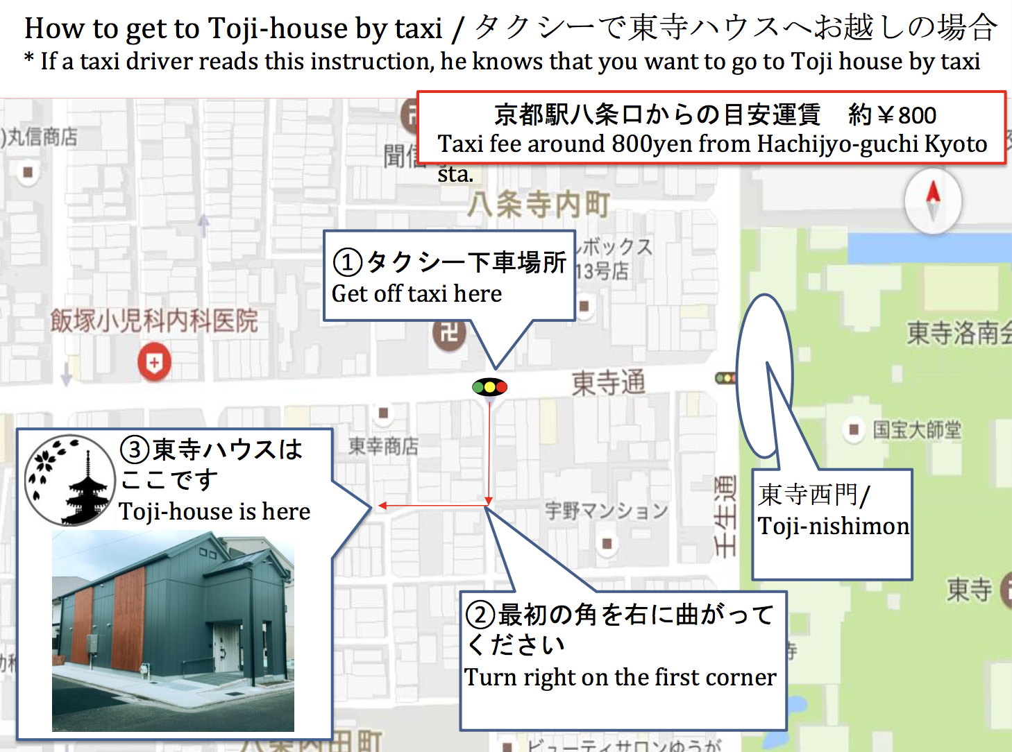以下に例を記しますので、資料作成時に参考にして下さい。京都は、通りの名前がわかればタクシーの運転手の方はどこに行きたいか分かりますので、あえて施設の住所は記載していません。他の地方では、物件の住所は記載した方が良いでしょう。また、印刷を容易にするため、必ずA4一枚で作成して下さい。
