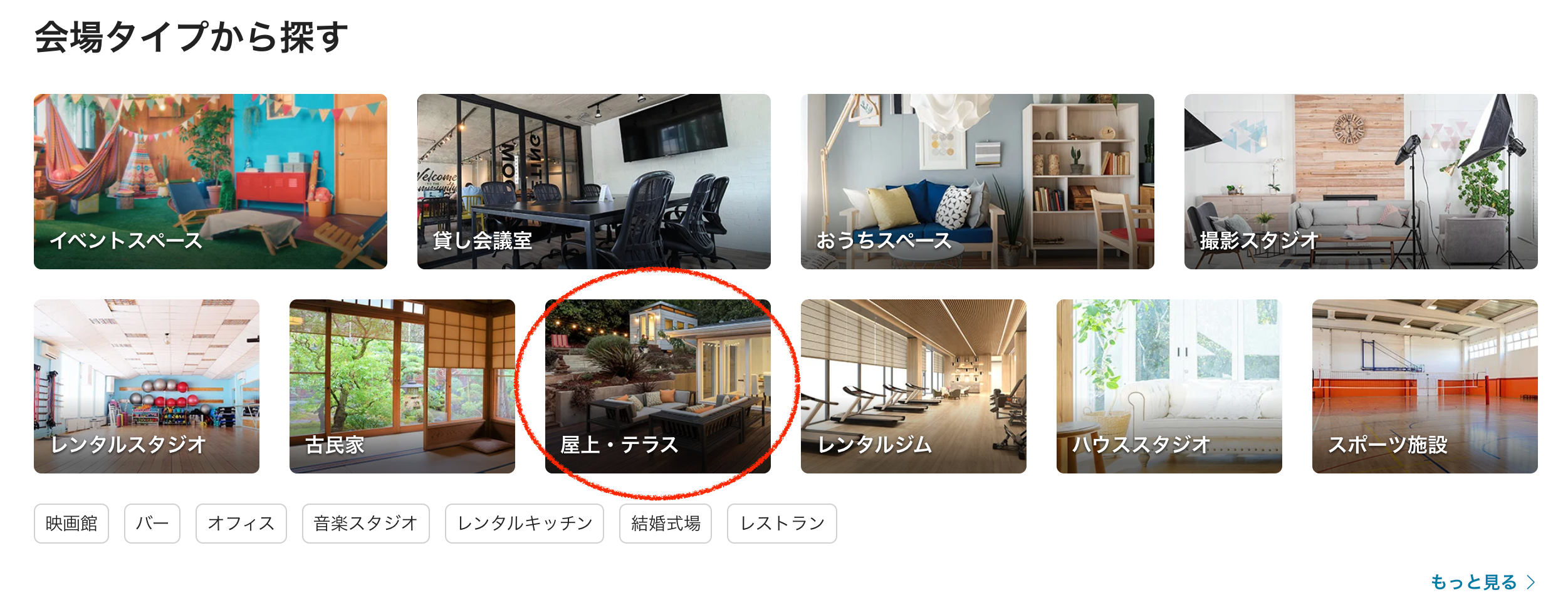 レンスペ大手のスペースマーケットでも、会場タイプに「屋上・テラス」の選択肢があります。