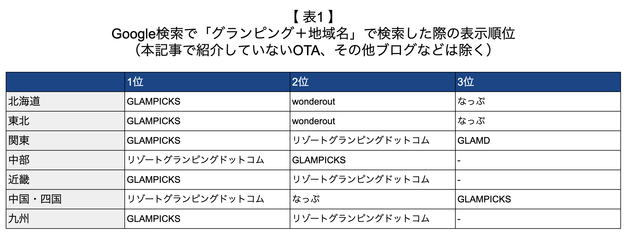 1. Googleでグランピング施設を検索した際の表示順位が高い(表1参照)