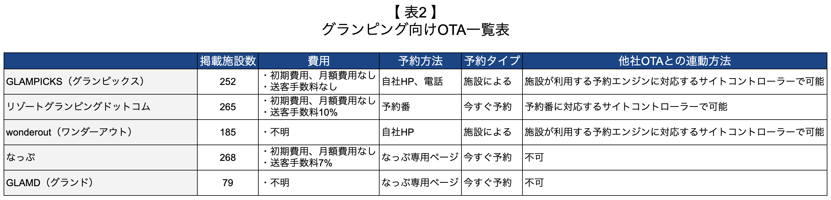 5つのグランピング向けOTA一覧表
