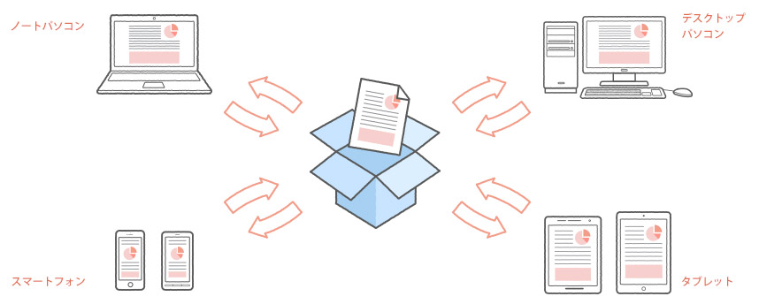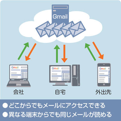 データがインターネット上にあるため、会社や自宅のパソコン、携帯電話やスマートフォンから、同じようにメールを読み書きできる。