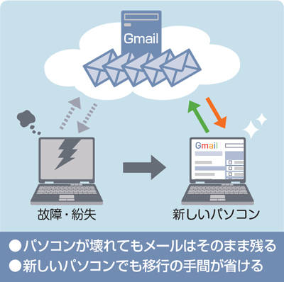 パソコンが壊れても、新しいパソコンでブラウザーを起動し、Gmailにログインすれば、以前と同じメール環境を取り戻せる。パソコンを買い替えた場合も、メールの移行という煩わしい作業は一切不要だ。