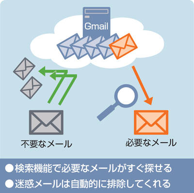 グーグルはもともと検索サービスを提供する企業なので、メール検索にも最新の技術を投入している。必要なメールは即座に見つけられるはずだ。迷惑メールを自動的に検出し、除去してくれる点もありがたい。