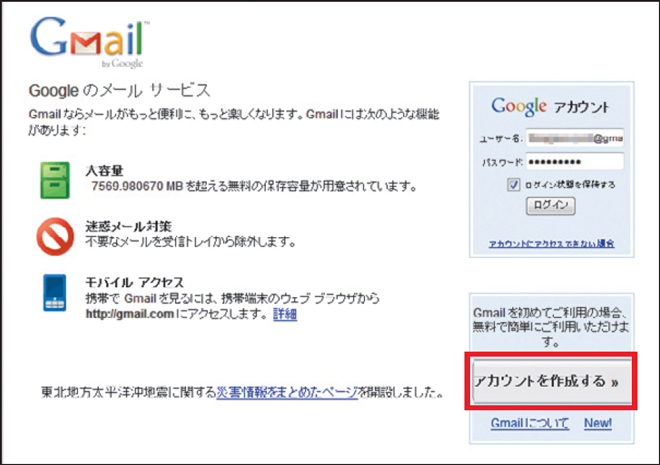 図1 Gmailを利用するには、まずhttp://mail.google.com/にアクセスしてログインする。Googleの各種サービスで使うアカウントを持っていない人は、「アカウントを作成する」をクリックし、続く画面で自分の情報を入力。アカウントを取得しよう。