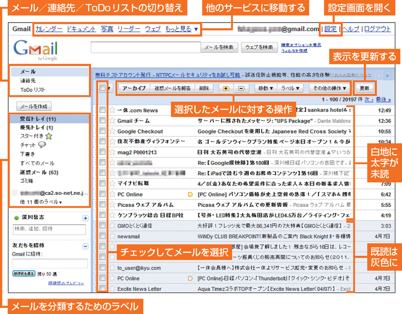 図2 Gmailの基本的な画面構成。メールの選択は一覧の左端にあるチェックボックスで行う。