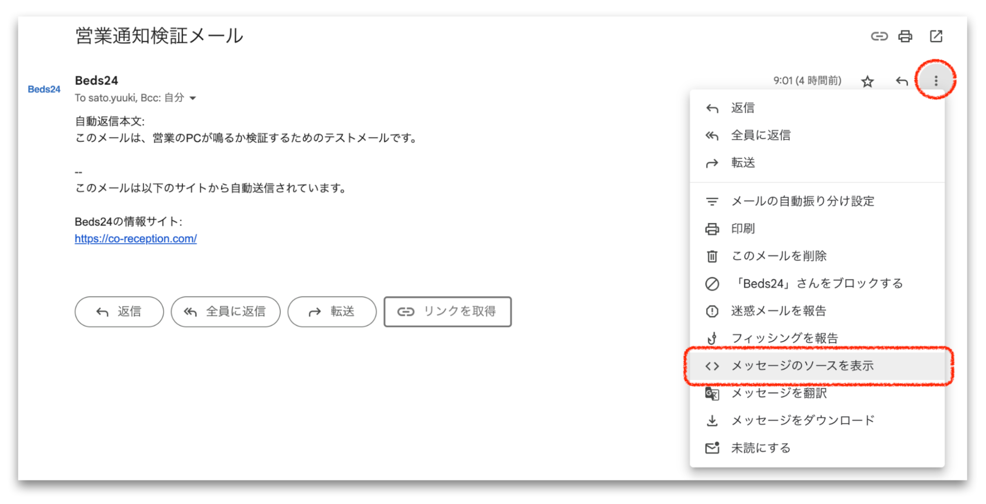 送信済みメールのメニューから、メッセージのソースを表示します。