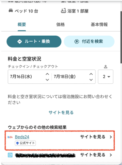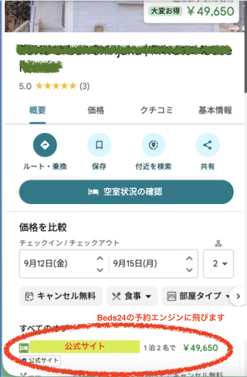 Beds24の予約エンジンをGoogleホテル広告と連携すると、Google検索やGoogleマップのホテル検索結果に、公式サイトの料金・空室状況が直接表示されます。