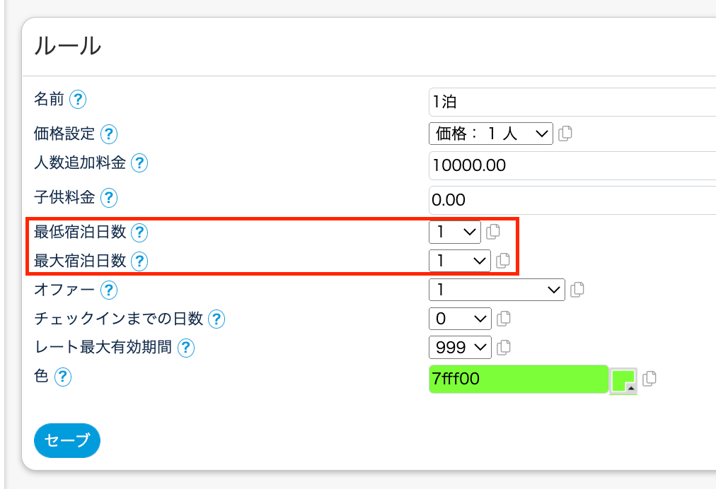 連泊をしない日が「1泊」であれば最低宿泊日数と最大宿泊日数は「1」で設定します