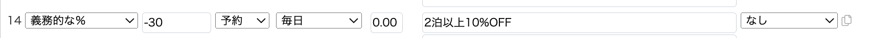・複数のオファーで連泊割を設定する場合、オファー毎に日別料金の料金欄を作成しなければならない為、日別料金の上限16行を圧迫する可能性がある
