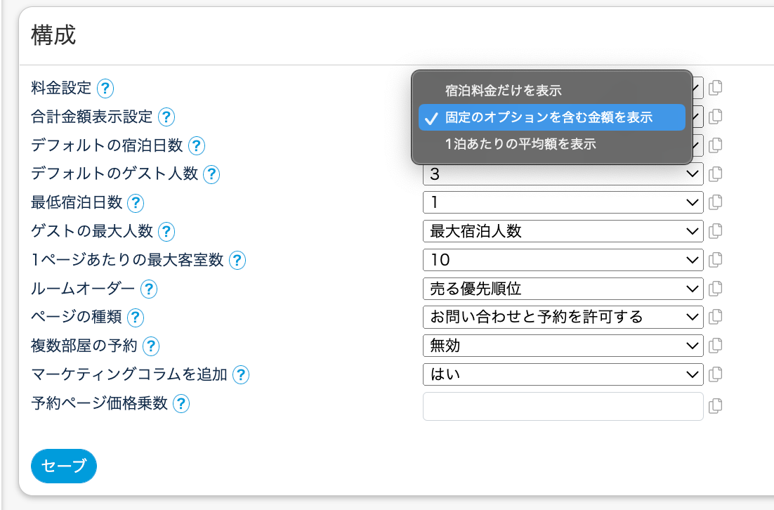設定 > 予約エンジン > プロパティ予約ページ > 合計金額表示設定 を「固定の金額を含むオプションを表示」にすると、予約画面の金額はアップセル適用後の価格になります。
