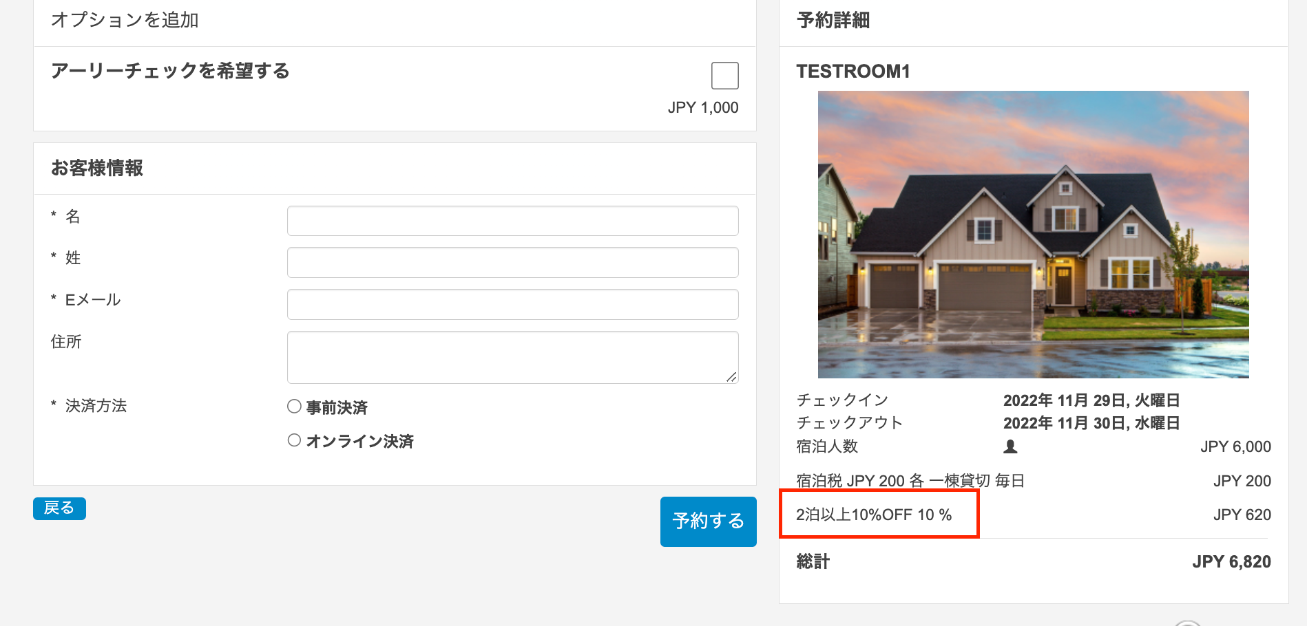 設定完了後、2泊以上を選択したゲストには予約フォームで右記画像の赤枠のように表示され、割引が適用されます。