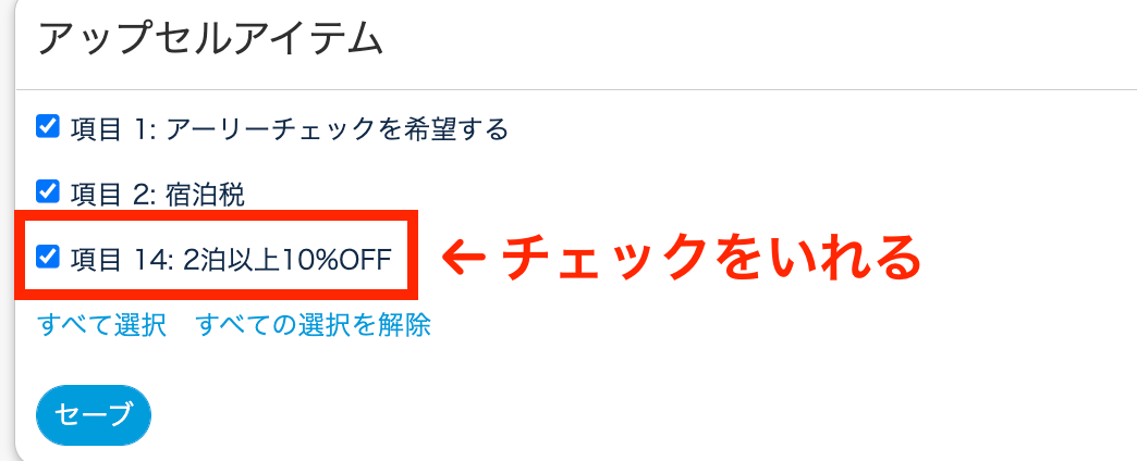 ※1泊の編集画面から、2.で作成したアップセルのチェックを必ず外してください。作成したアップセルは、自動的にチェックが入ります。