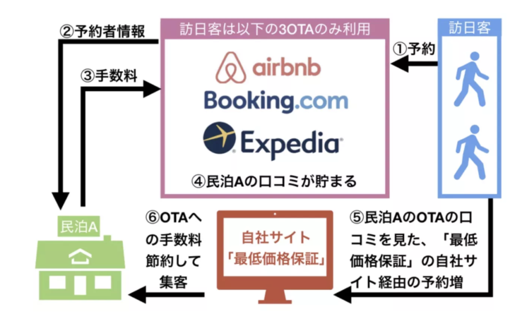 ホテル、旅館業では普通のこの「最低価格保証の自社HP誘導」は、民泊業界ではまだ浸透していません。理由として、民泊は不動産業者の方々を中心に、宿以外の他業界からの参入が多いため、自社HPで販売したご経験が無い民泊管理者の皆様が多い為です。民泊を運営する方に、自社サイトでの販売という方法をお伝えしたく、この記事を執筆しました。