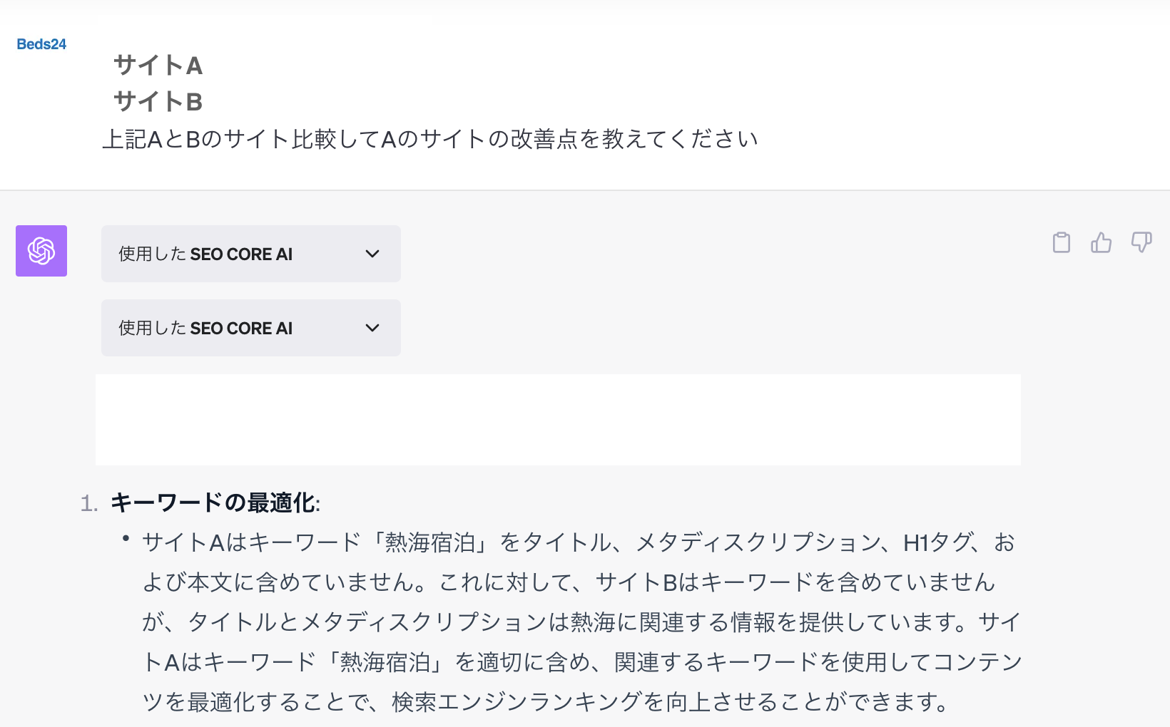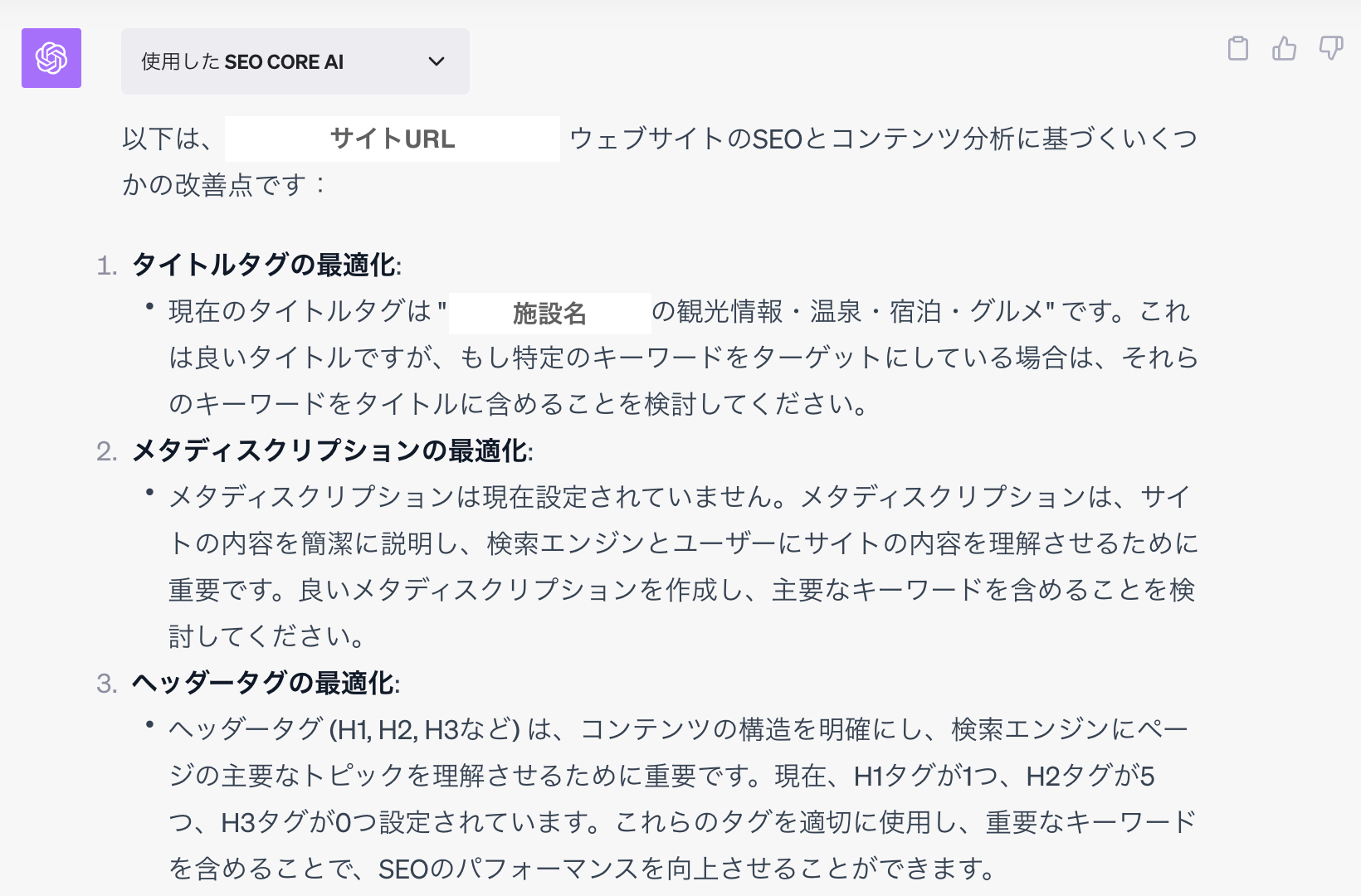 SEO CORE AIを使用すれば、SEO対策のアドバイスがもらえます。