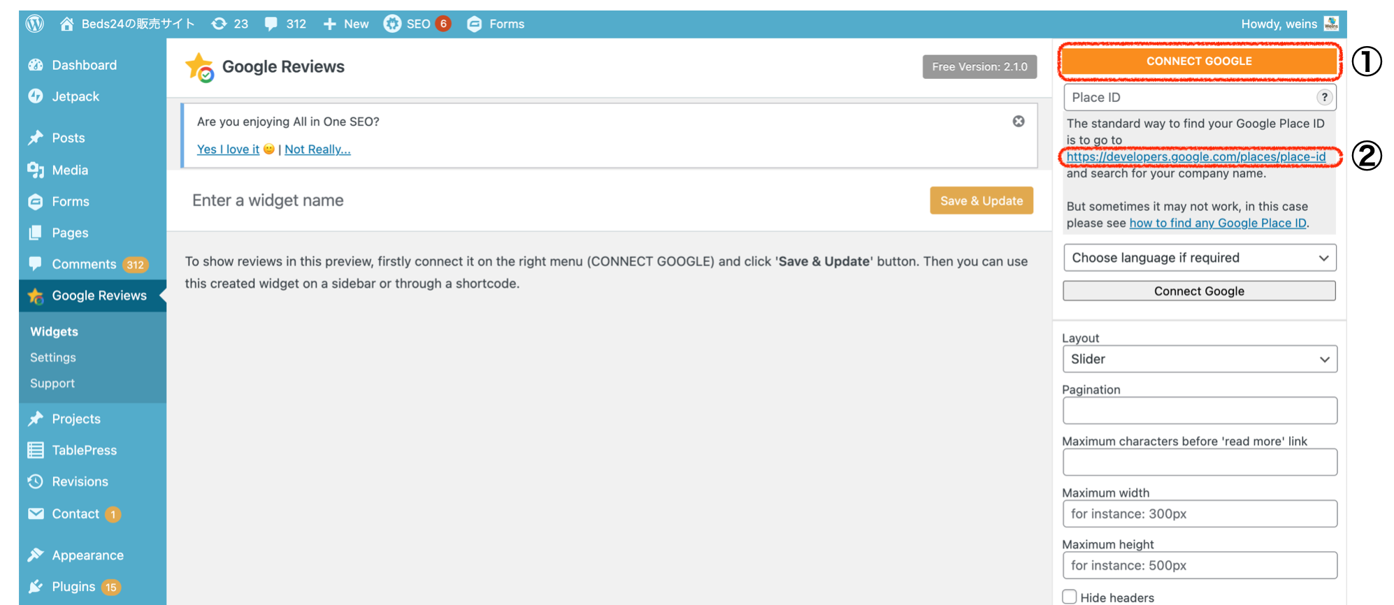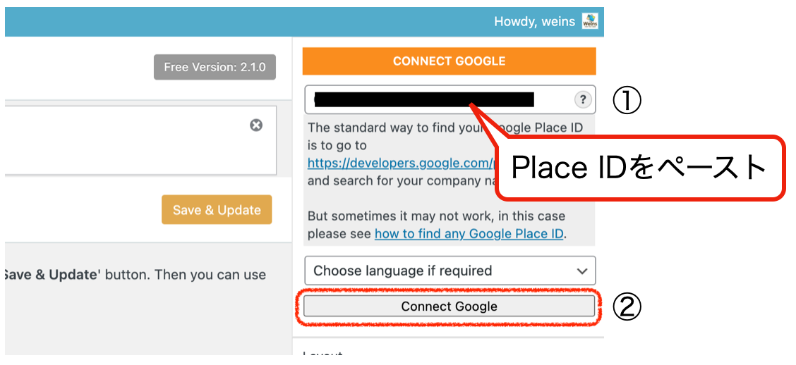 ④Place IDを画像の箇所にペーストし、『Connect Google』をクリック