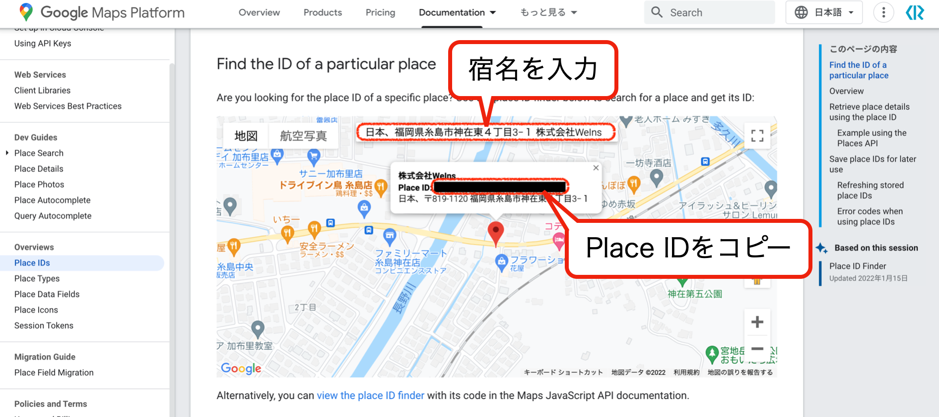 ③開いたページの地図で宿を検索し、Place IDをコピー