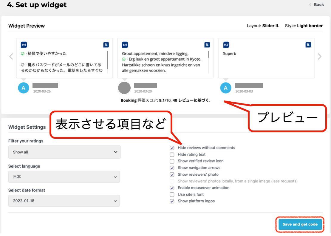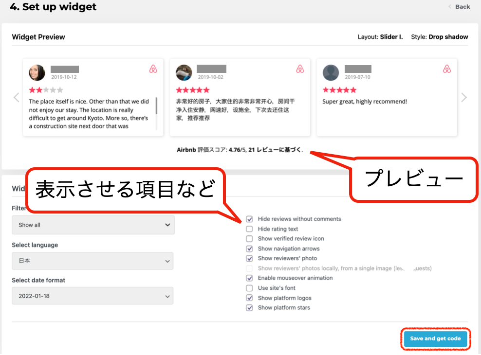 ⑦表示させる項目などをチェックし、『Save and get code』をクリック