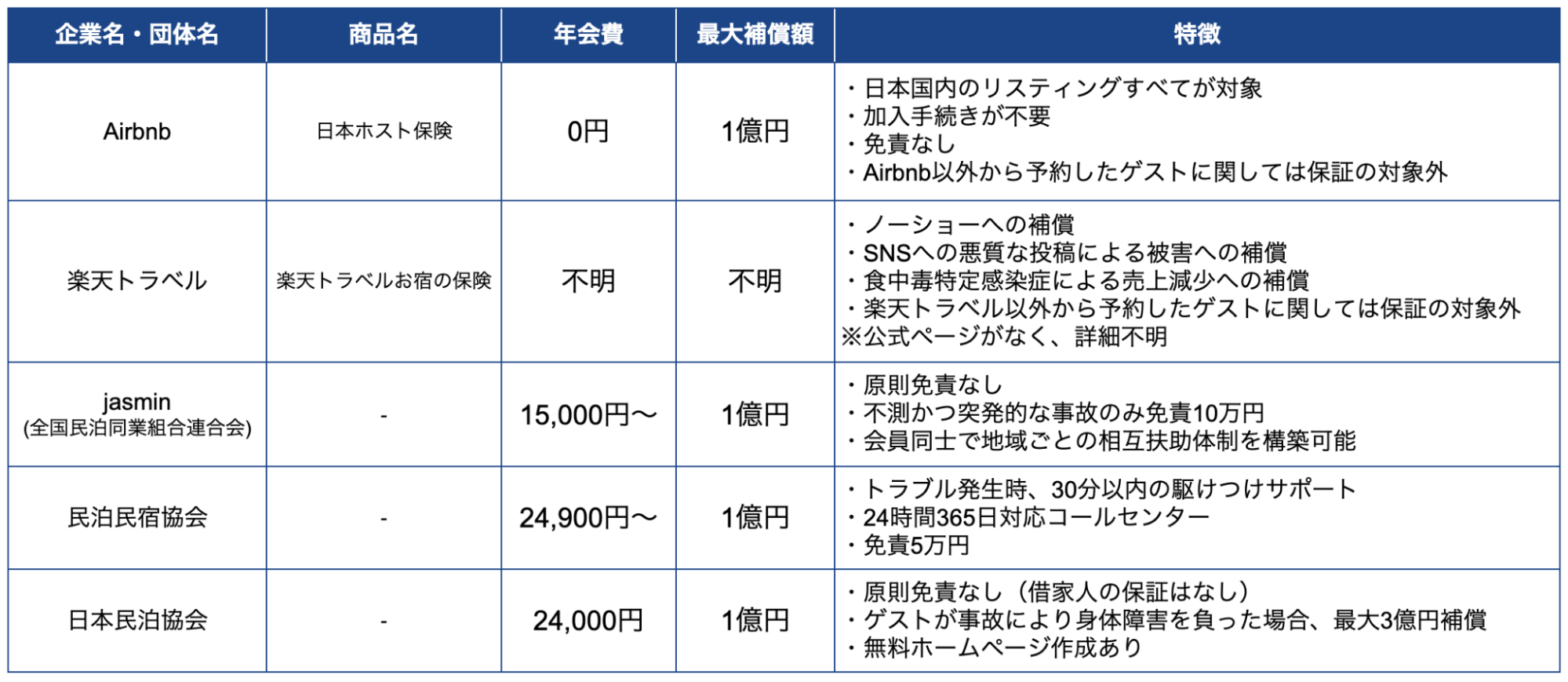 民泊向け保険一覧表