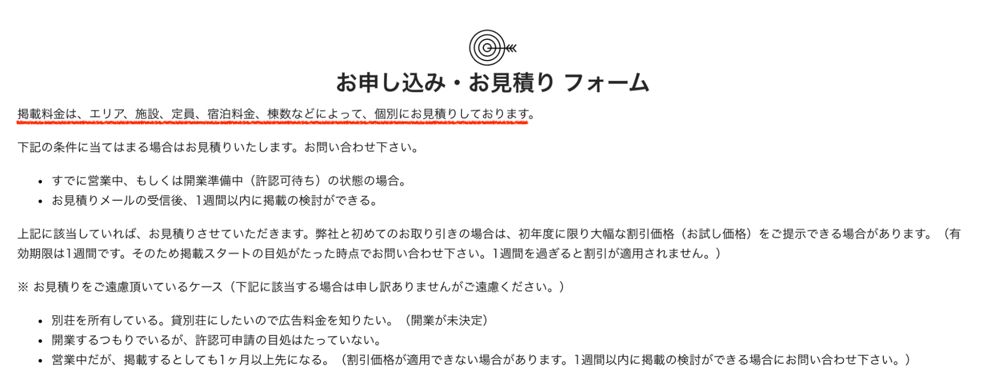 エリア、施設、定員、宿泊料金、棟数などによって、個別に見積りを出してもらいます。