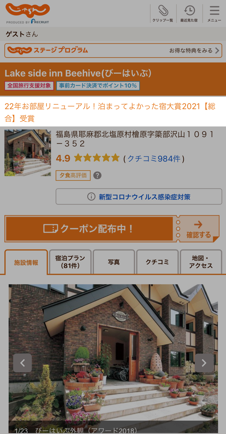 また、宿のページには、受賞したことが明記されます。