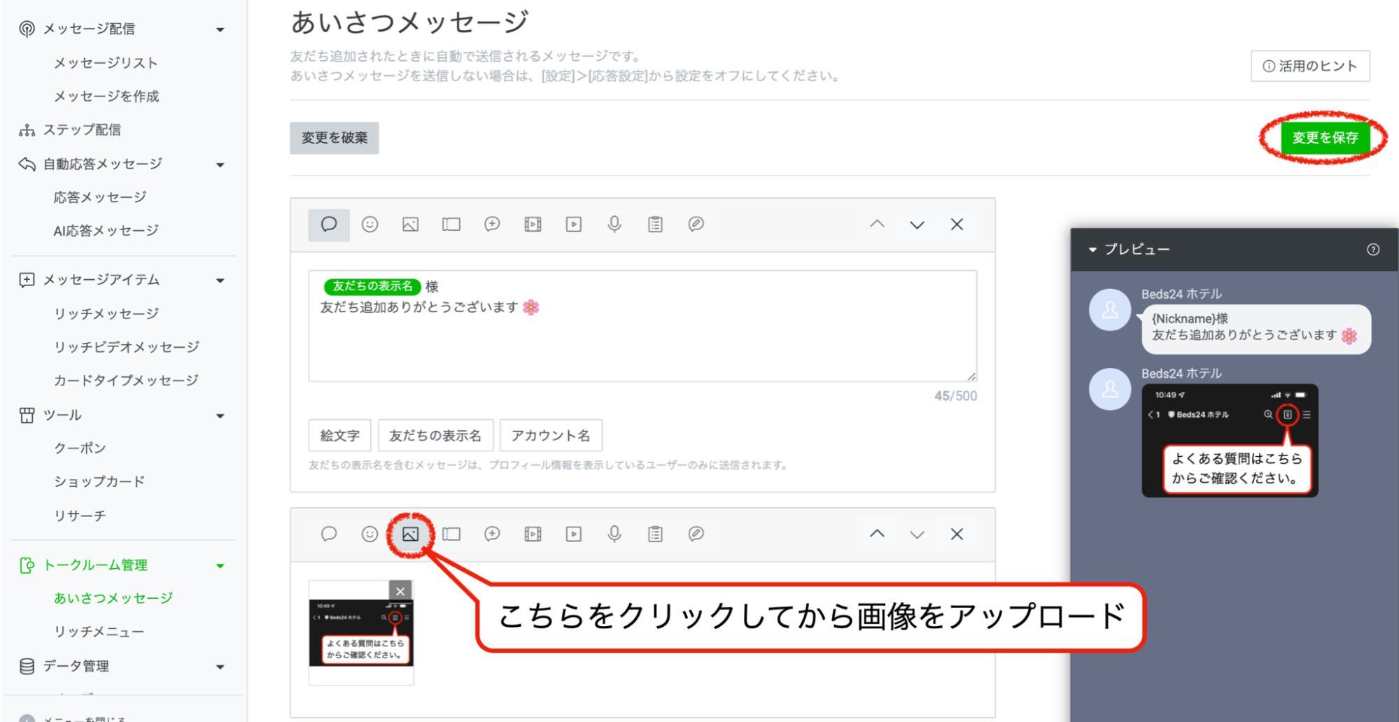 ②あいさつメッセージに[よくある質問]の見方を説明する画像を添付
