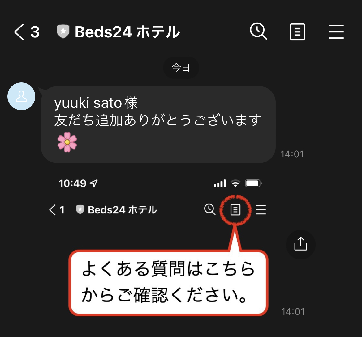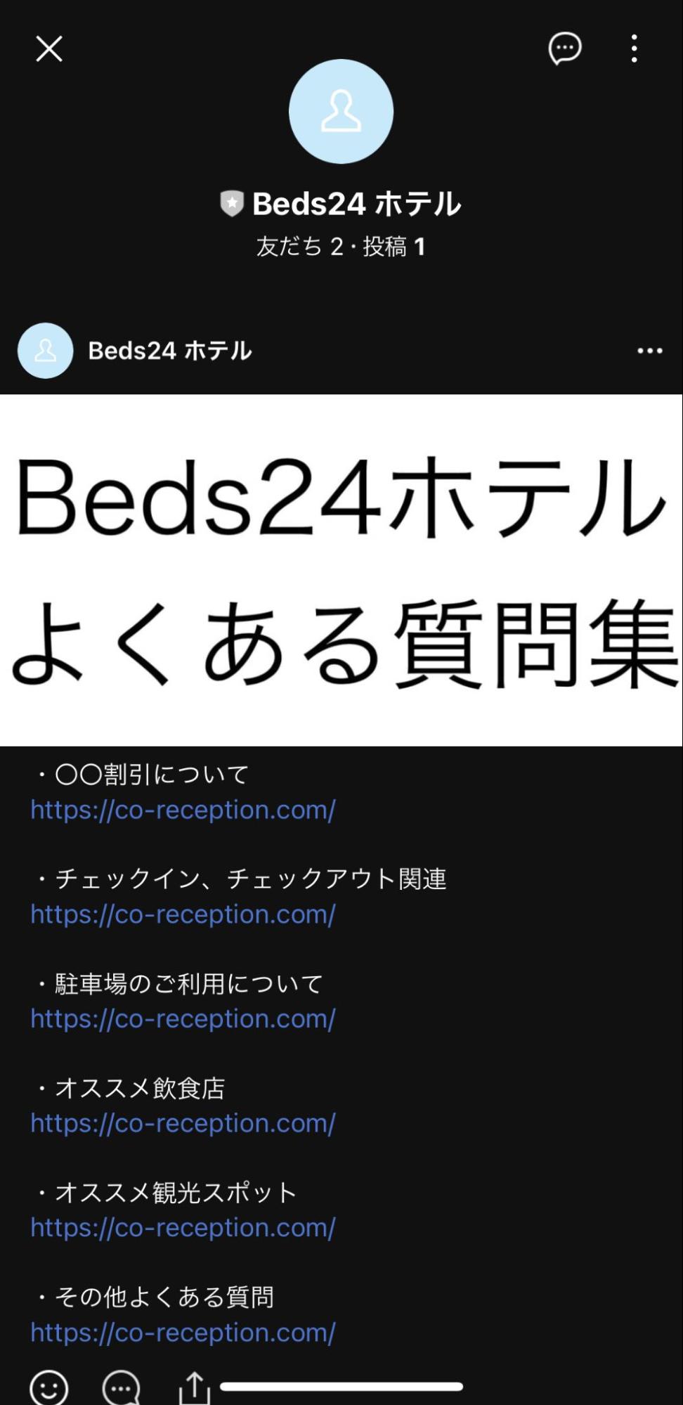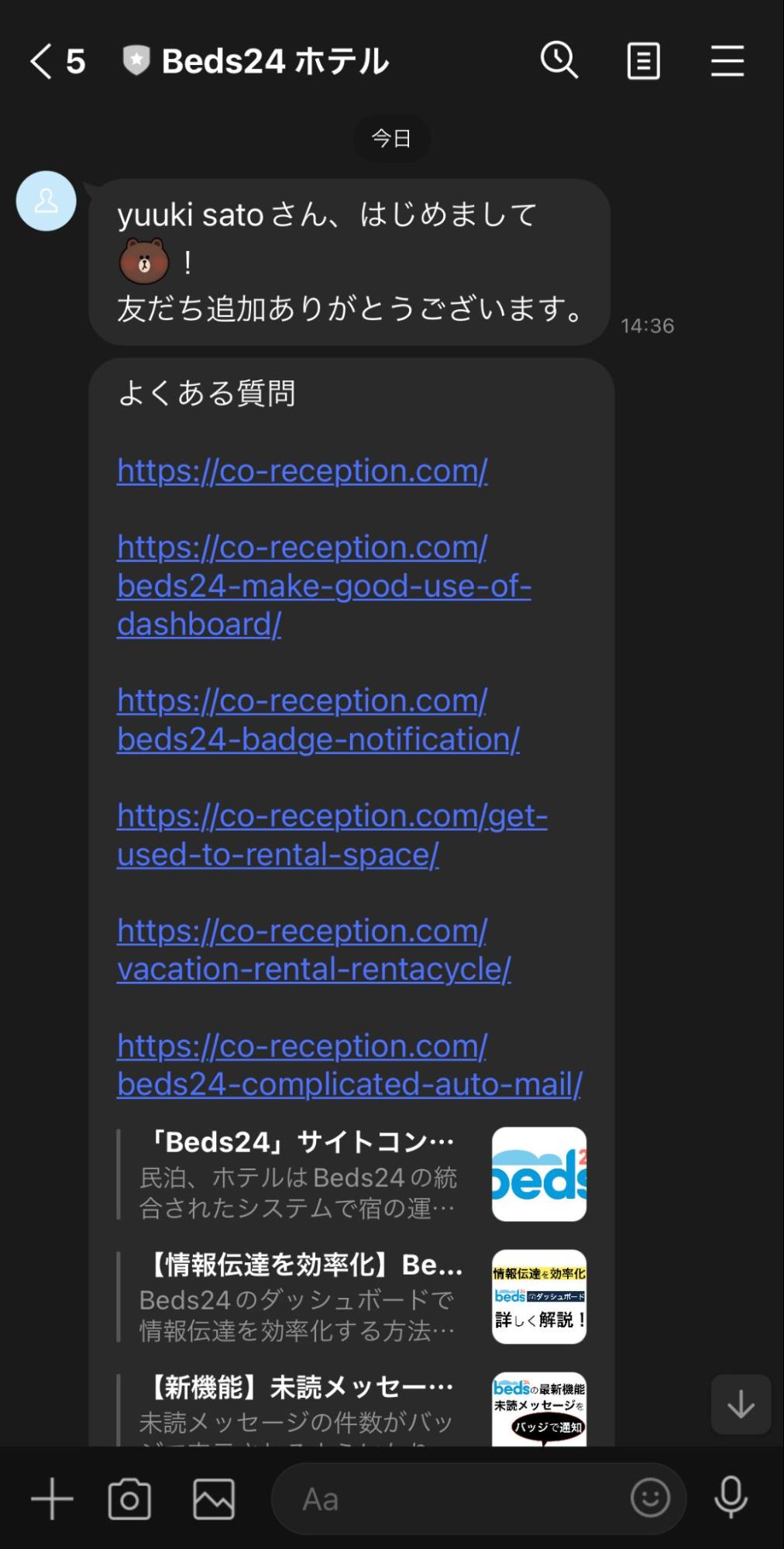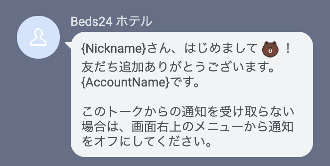 友達追加してもらった際、ゲストに自動送信されるメッセージです。