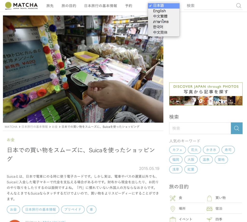 マッチャというサイトで「IC乗車券(スイカ)の使用法」などのノウハウ記事が訪日外国人に人気です。全記事が、英語、日本語、中国語、韓国語、タイ語で書かれています。