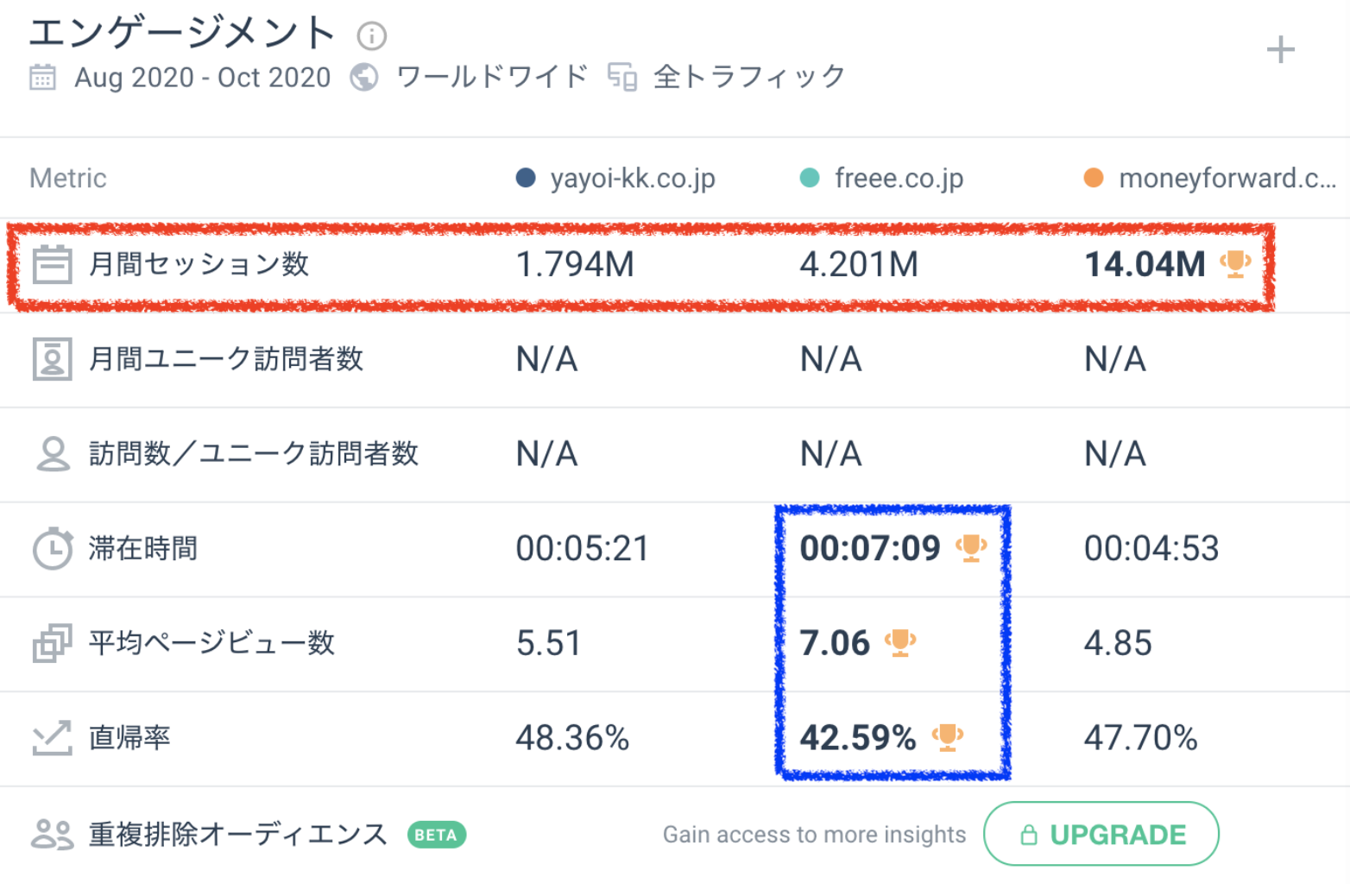 以下の画像の青い枠の滞在時間、平均ページビュー、直帰率という指標ではFreeeがかなり強いです。