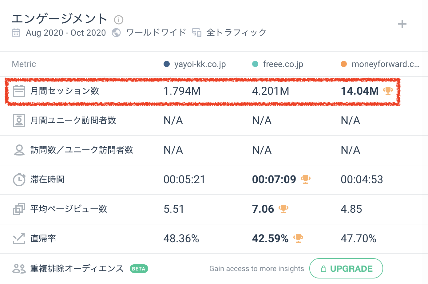 以下の画像の赤枠のセッション数(訪問者数)で見ると、マネーフォワードは圧倒的に強いです。
