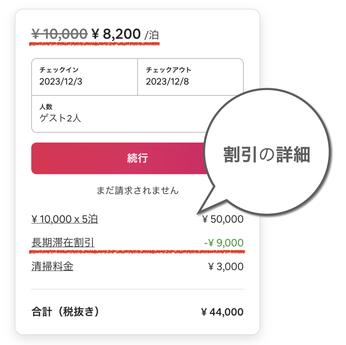 割引表示が目立ち、長期滞在者にお得感をPRできます。