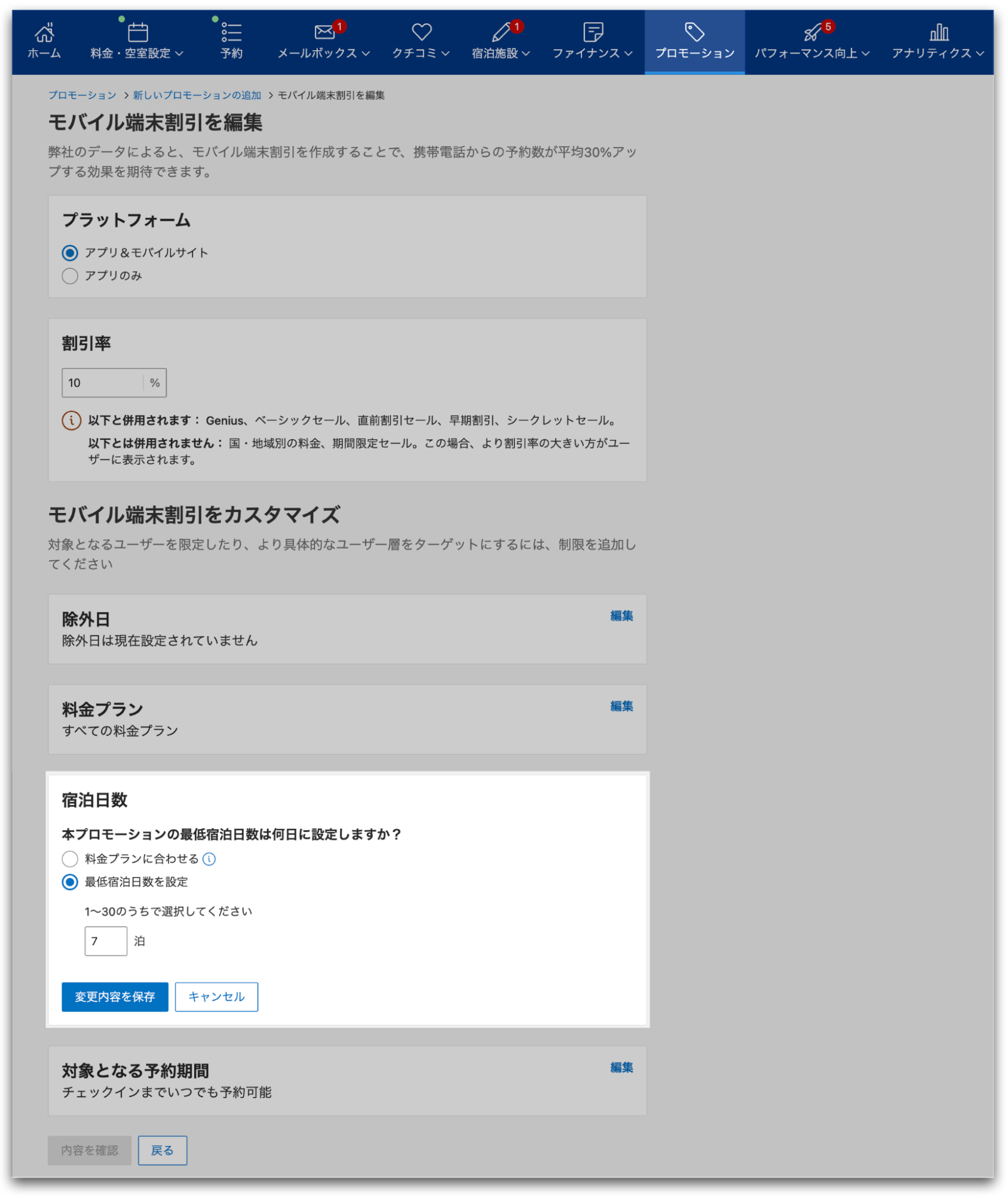 とはいえ、モバイル割で最低宿泊日数を設定することで代用可能です。