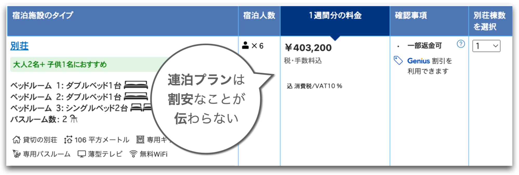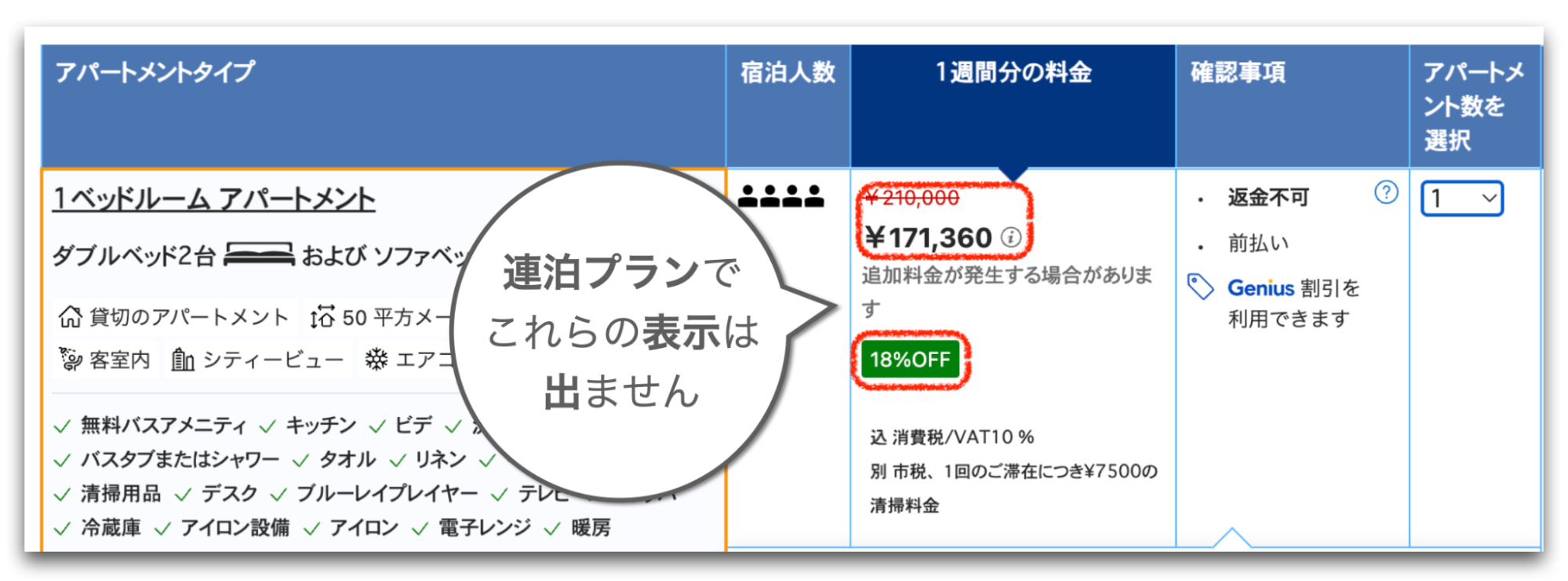 Booking.comには、連泊割引のプロモーションが用意されていません。
