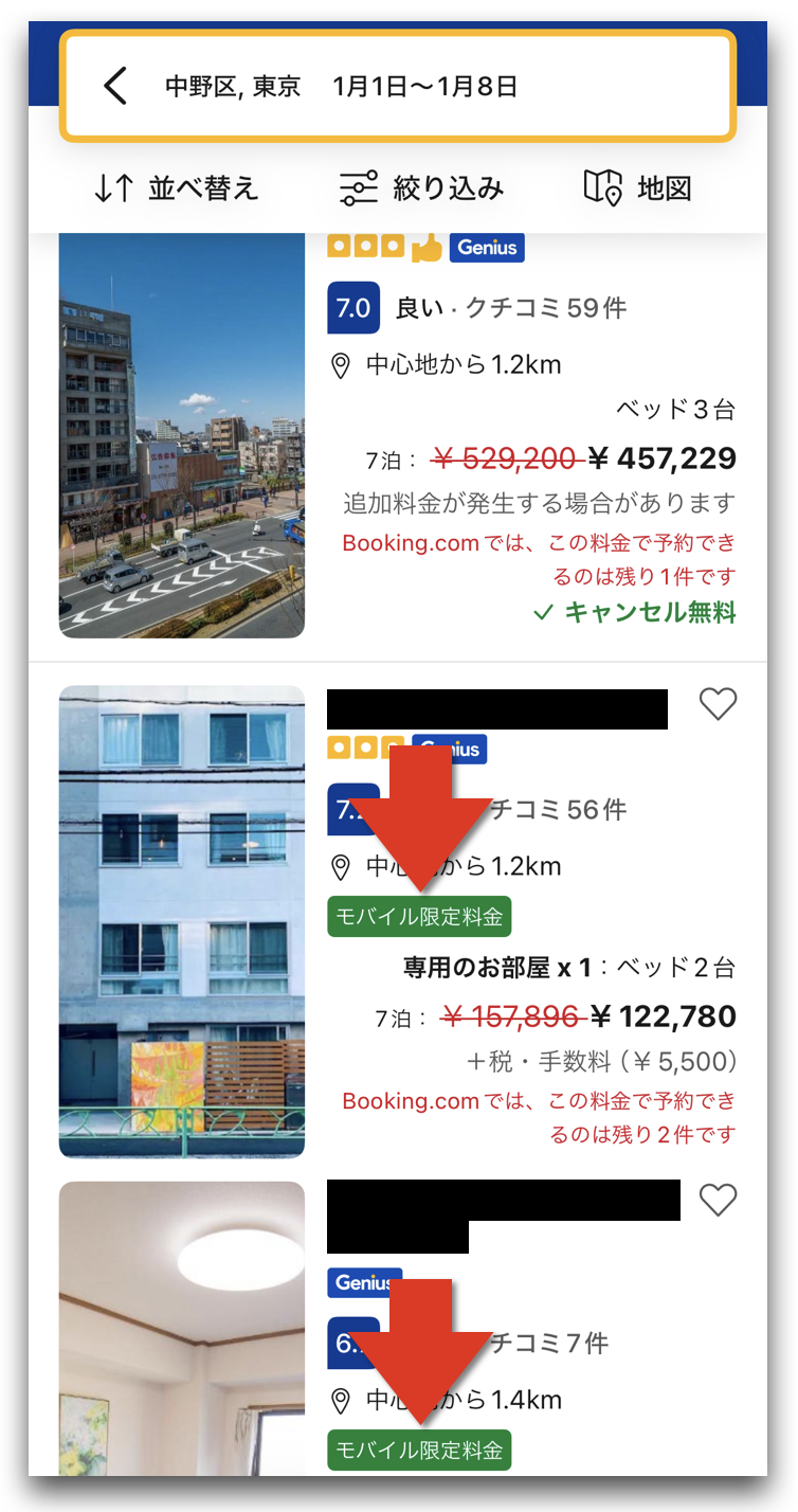 以上で、スマホで予約する7泊以上の人だけに緑色のラベルが表示されます。