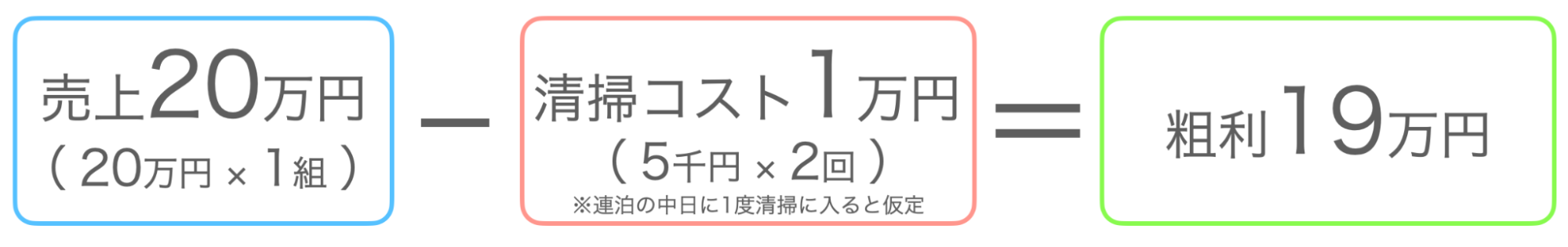 1泊の売上『2万円』、清掃コスト『5千円』と仮定して解説します。