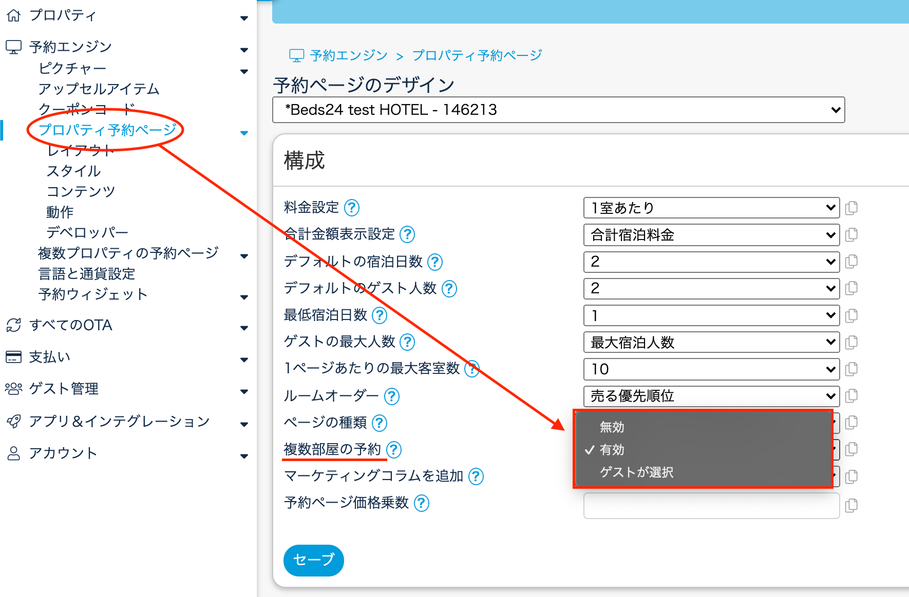 設定 > 予約エンジン > プロパティ予約ページで、複数の部屋の予約を「無効」にしてセーブします。