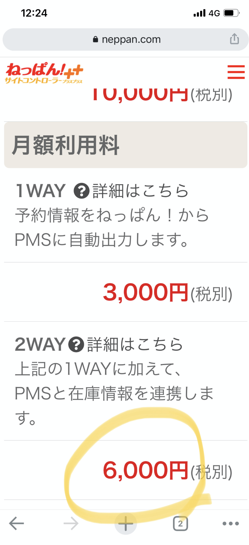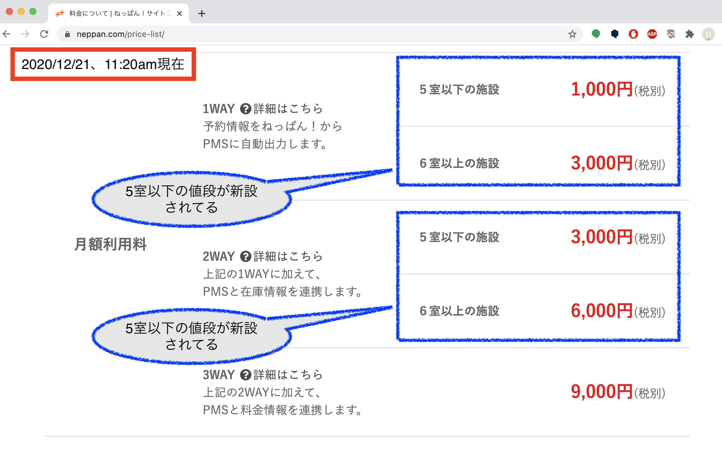 偶然、筆者が撮影した2020年12月19日のお昼頃のスクリーンショットでは、ねっぱんのPMSの連携オプション料金の場所に5部屋以下の料金は確認できません。