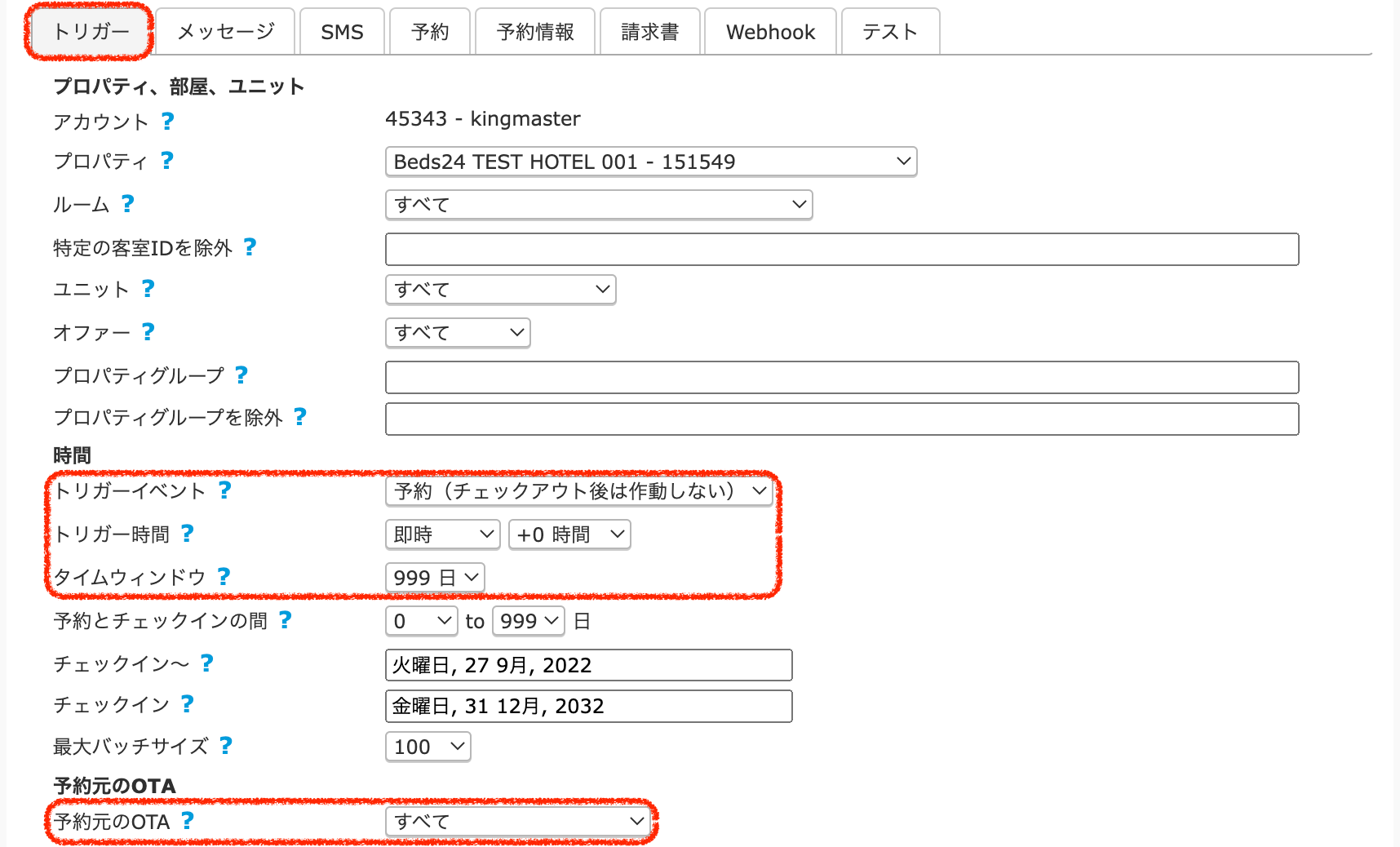 ③トリガータブで『時間』『予約元のOTA』を以下のように設定