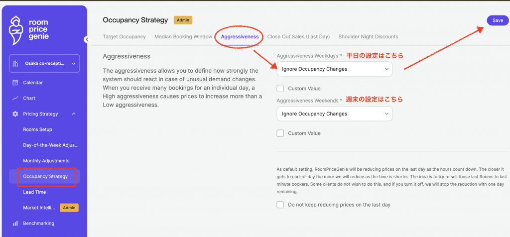 非常に低いアグレッシブネスまたはアグレッシブネスなしの場合、市場に追従し、販売する残り客室数を加味しません。