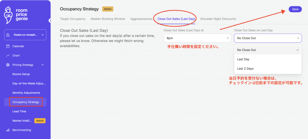 特定の時間以降に当日の販売を停止している場合は、RoomPriceGenieでも同様に設定してください。