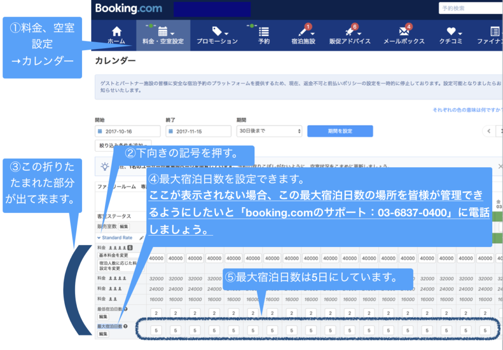 ブッキングドットコムでの設定方法を説明します。①〜⑤の方法を行なってください。