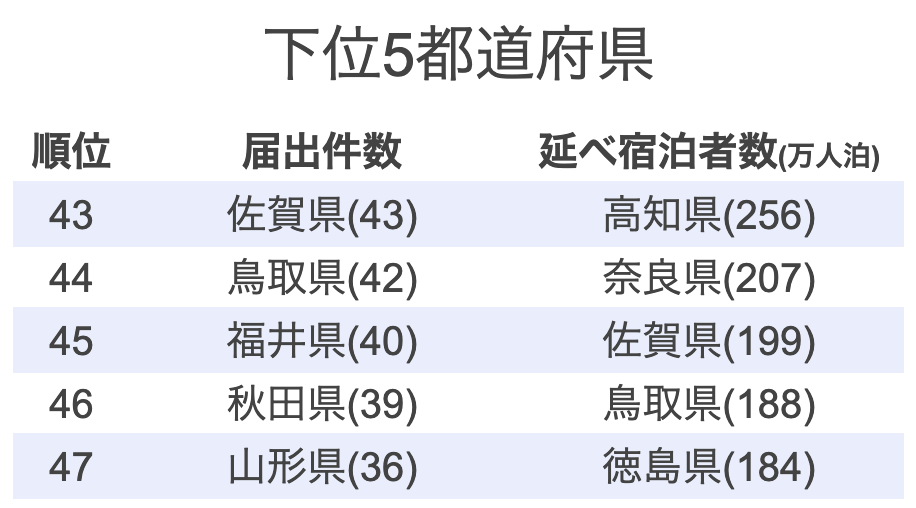 この5県の顔ぶれ。民泊届出件数の下位5県とずいぶんと異なります。