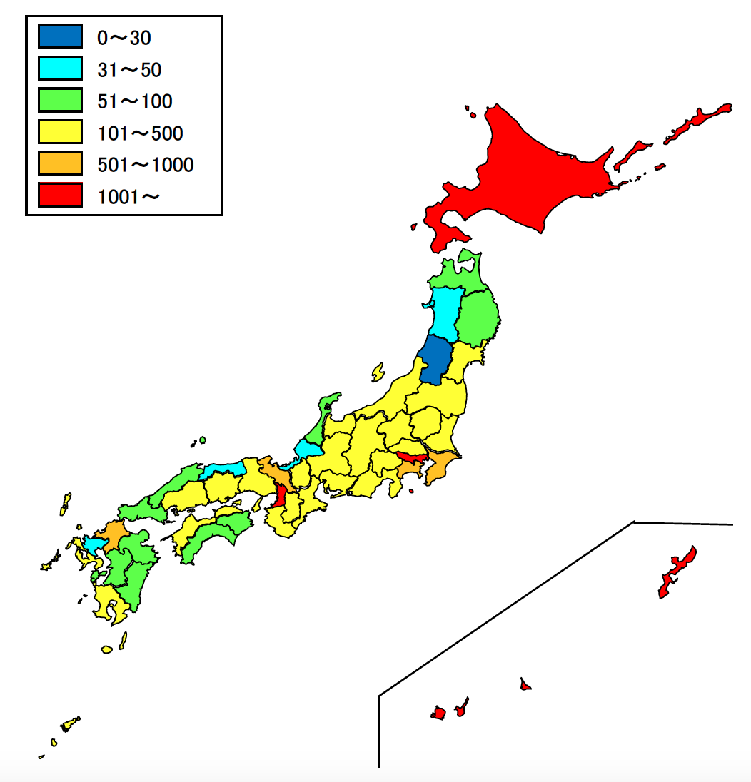 いずれも50件以下と極めて少なく、なぜか日本海側に多い傾向にあります。