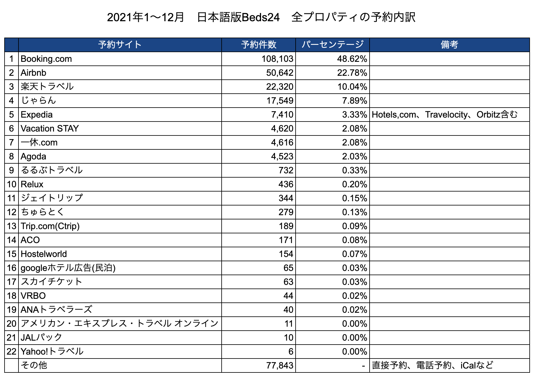 この度、日本語版Beds24で2021年の全予約データを調査しました。