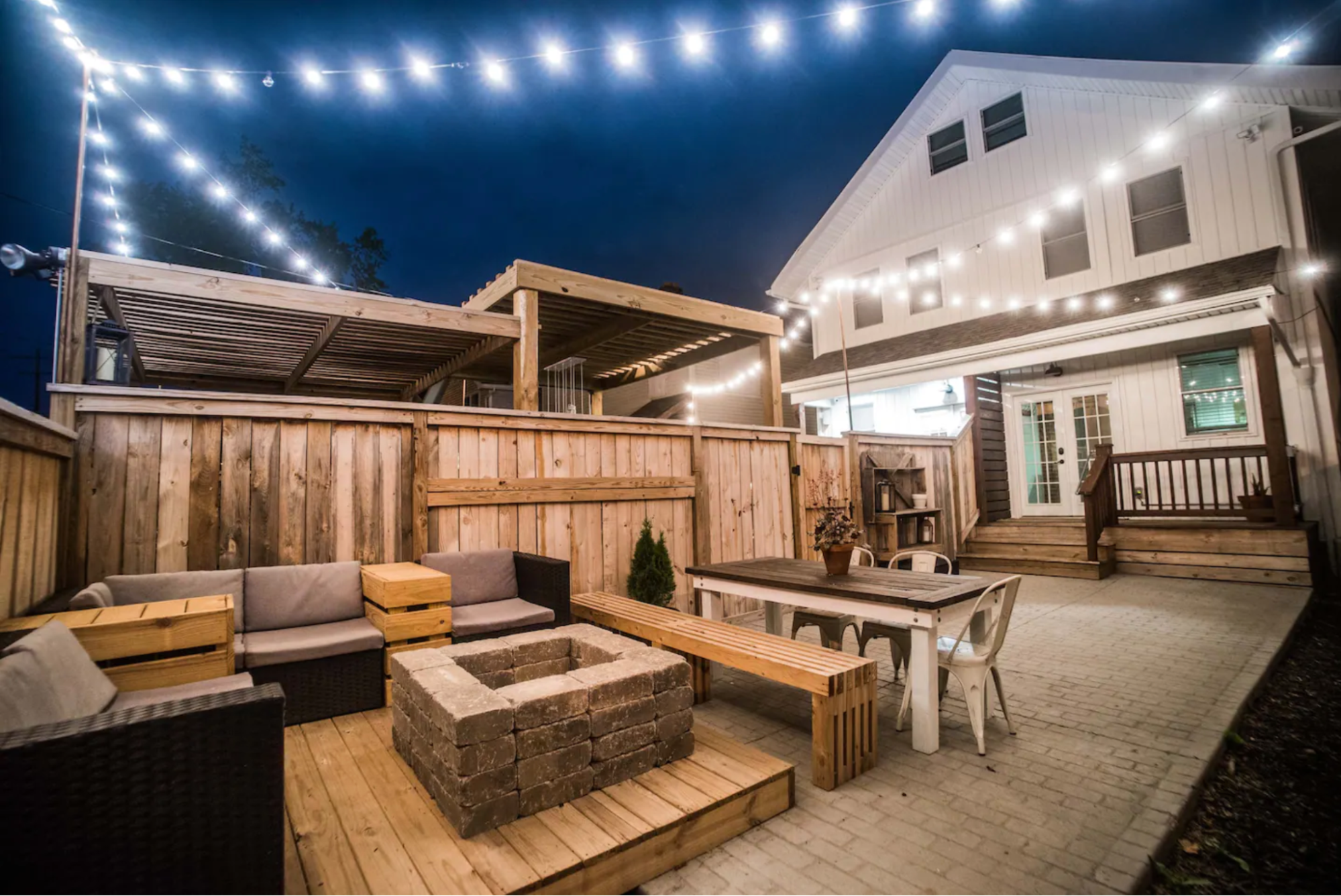裏庭のパティオにはライトが張られ、暖炉とソファがあります。
