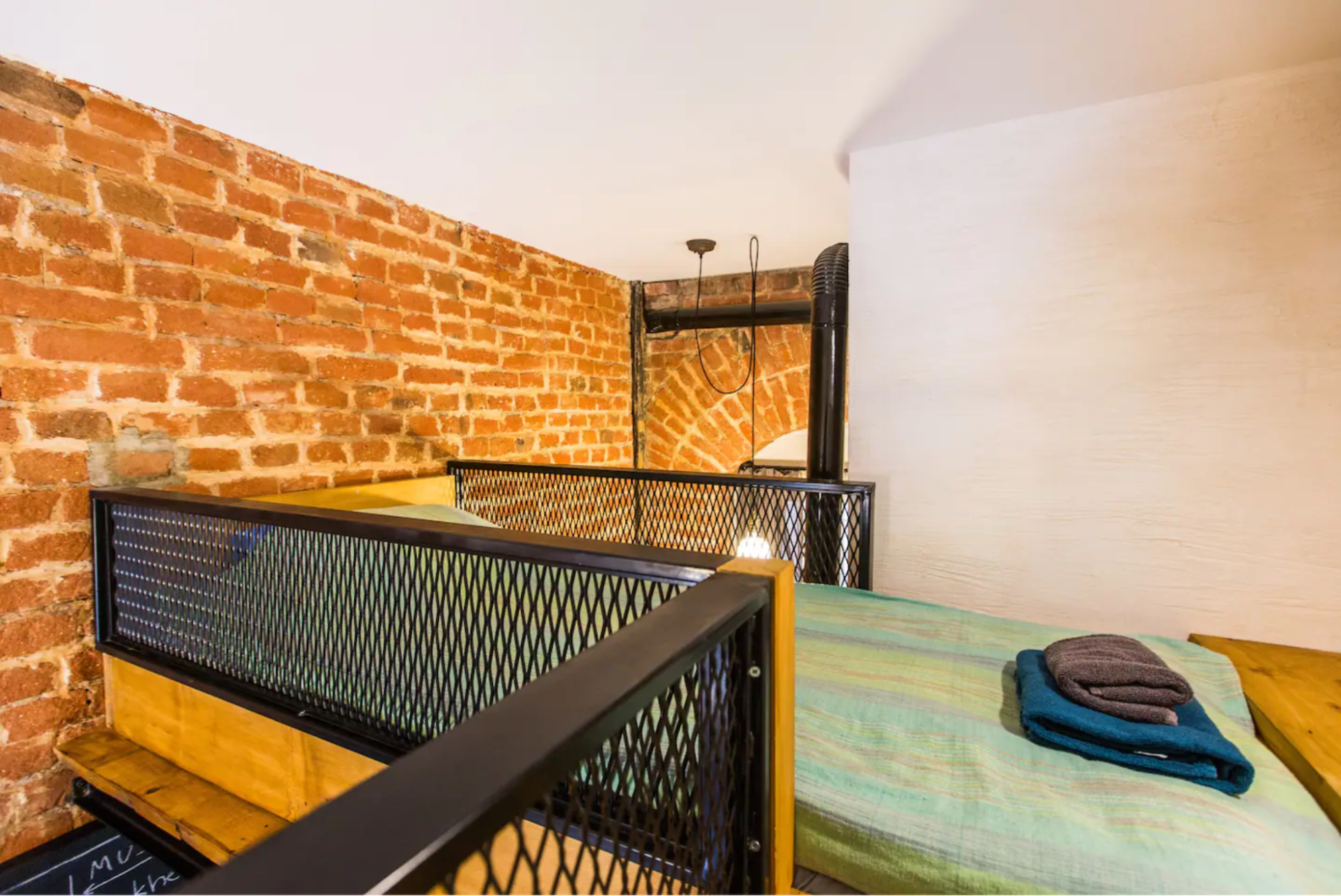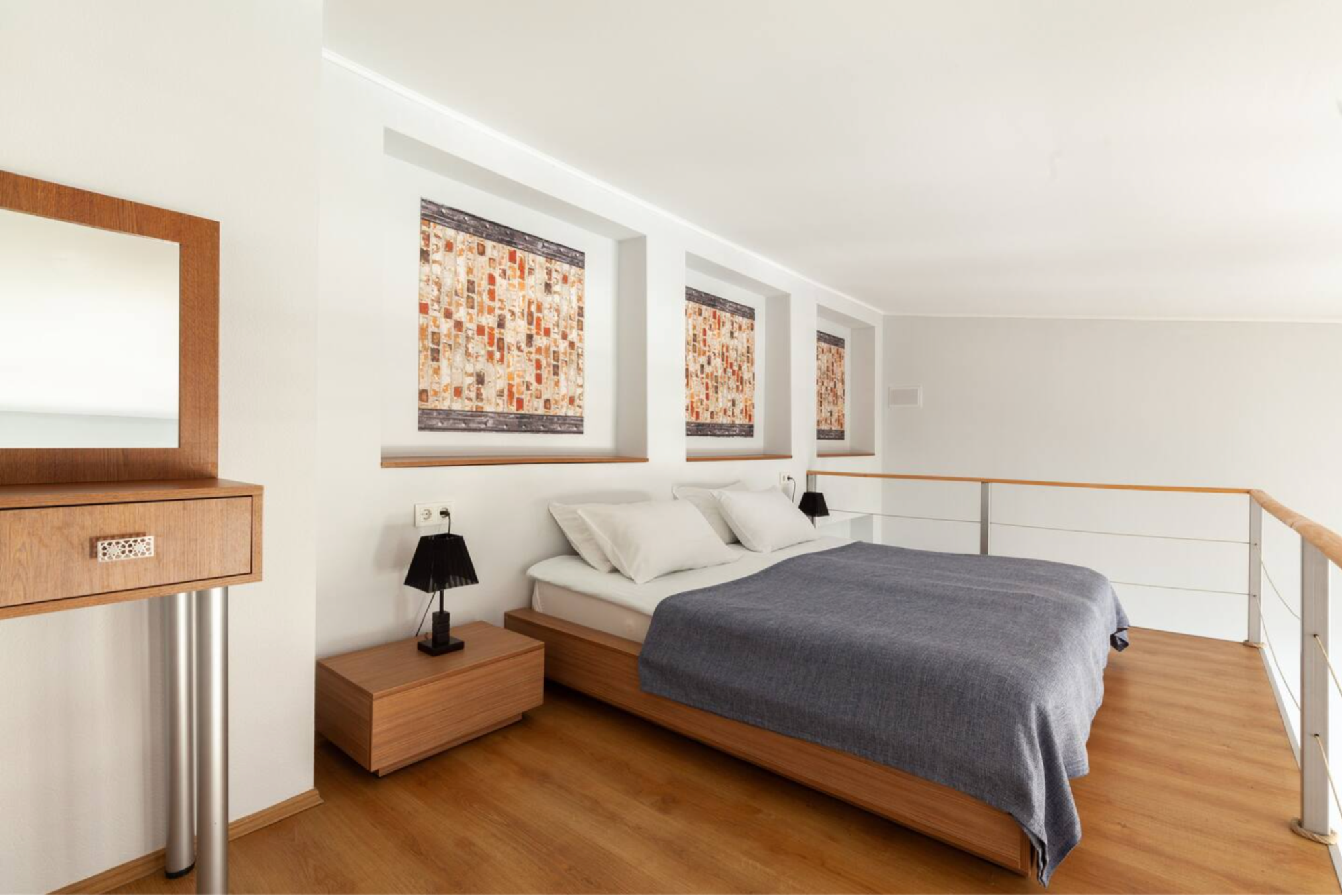 中2階には素敵な布団をかけた、大きくて快適なベッドが置かれています。