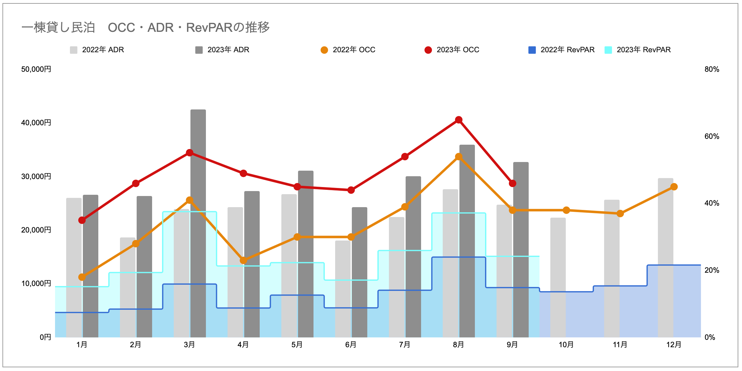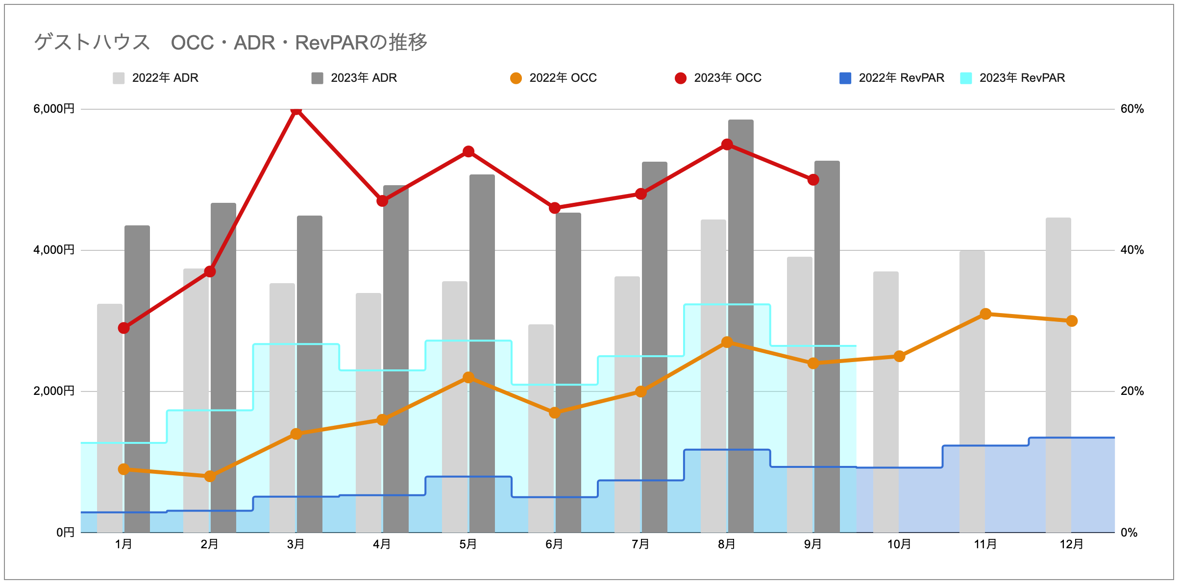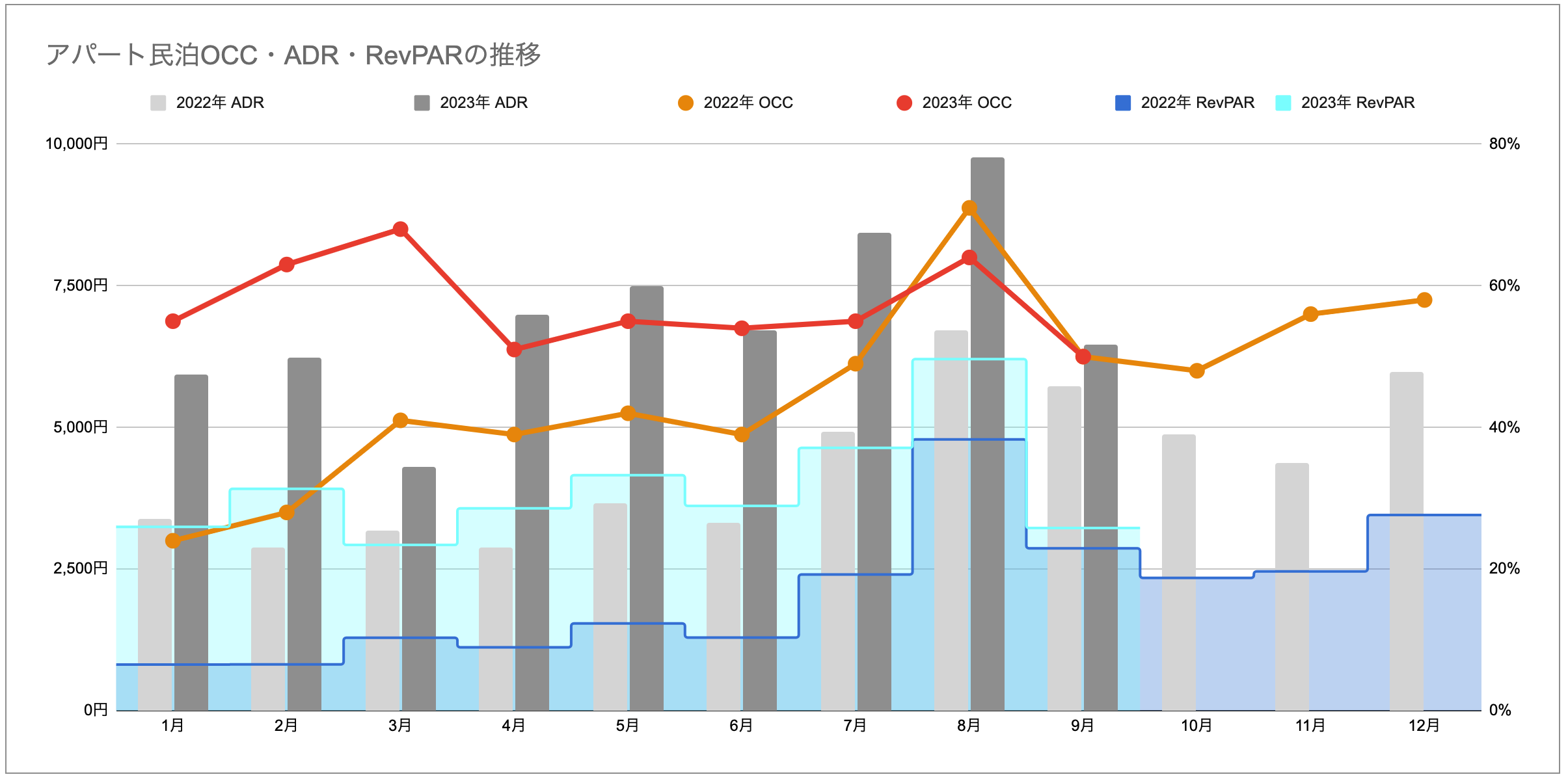 2023年8月比では、OCC、ADRの減少に伴い、RevPARも下がっています。